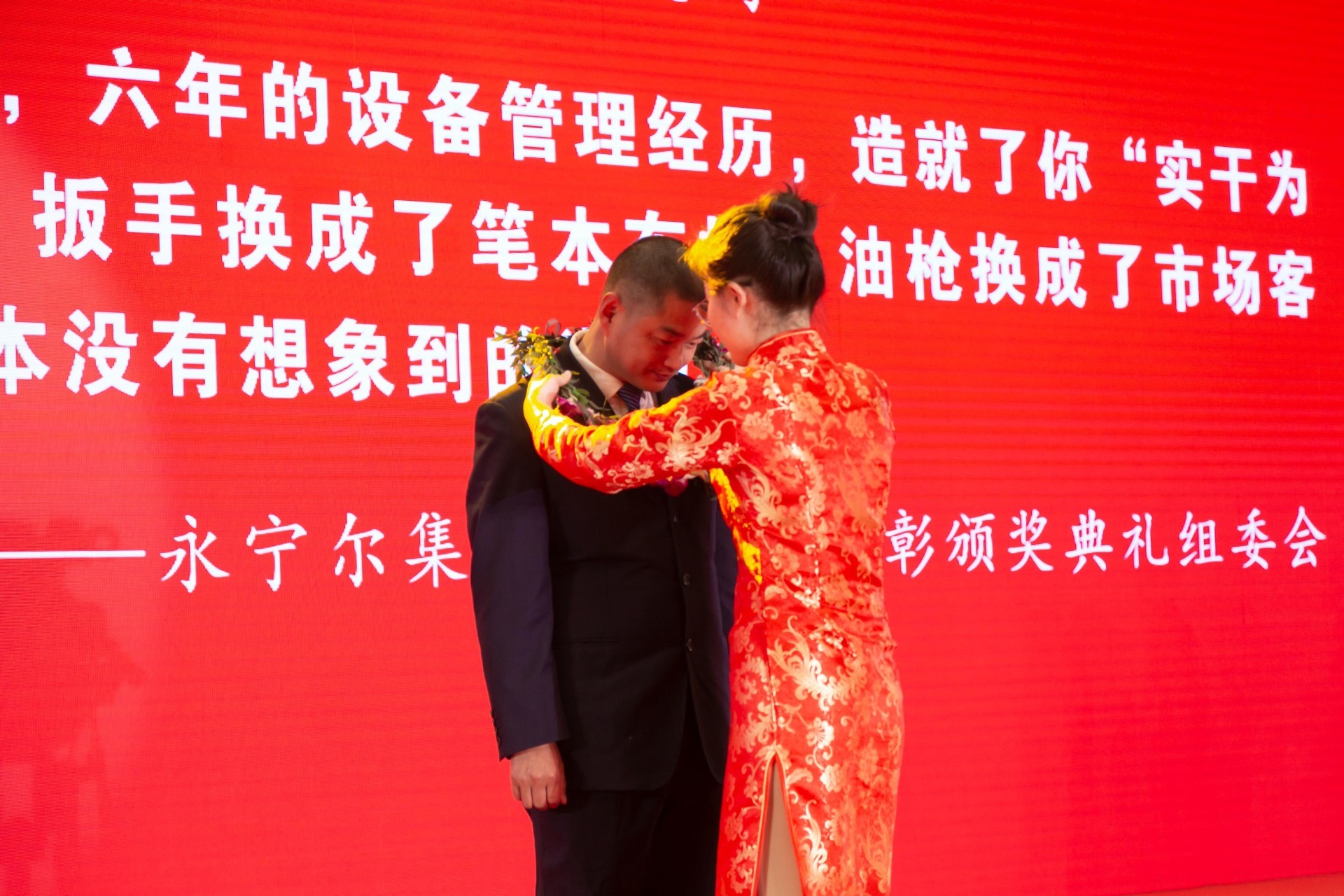 李咏水董事长为2020年度“宝马bm1122线路顶级功勋金质奖章”获得者朱海江颁授金牌