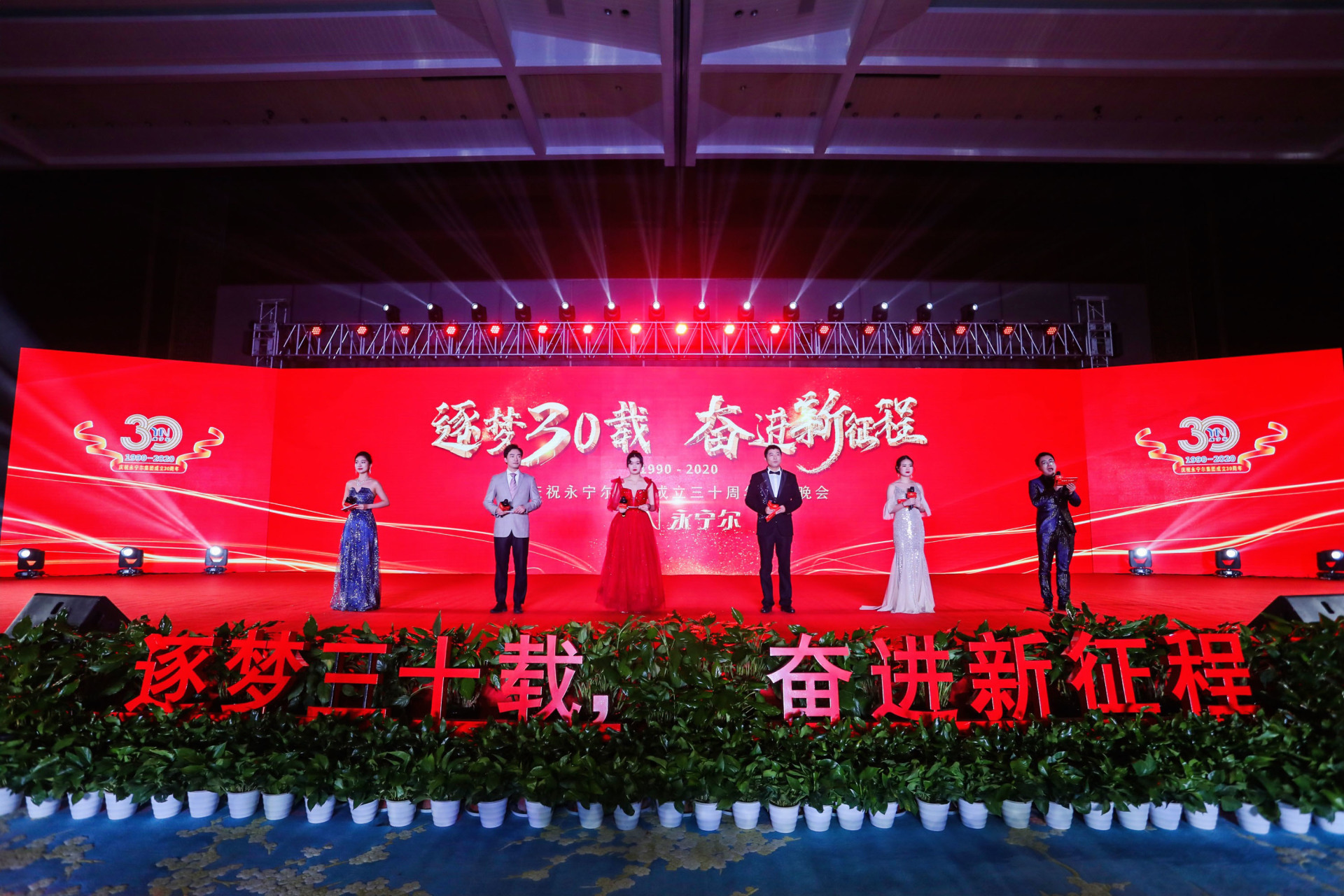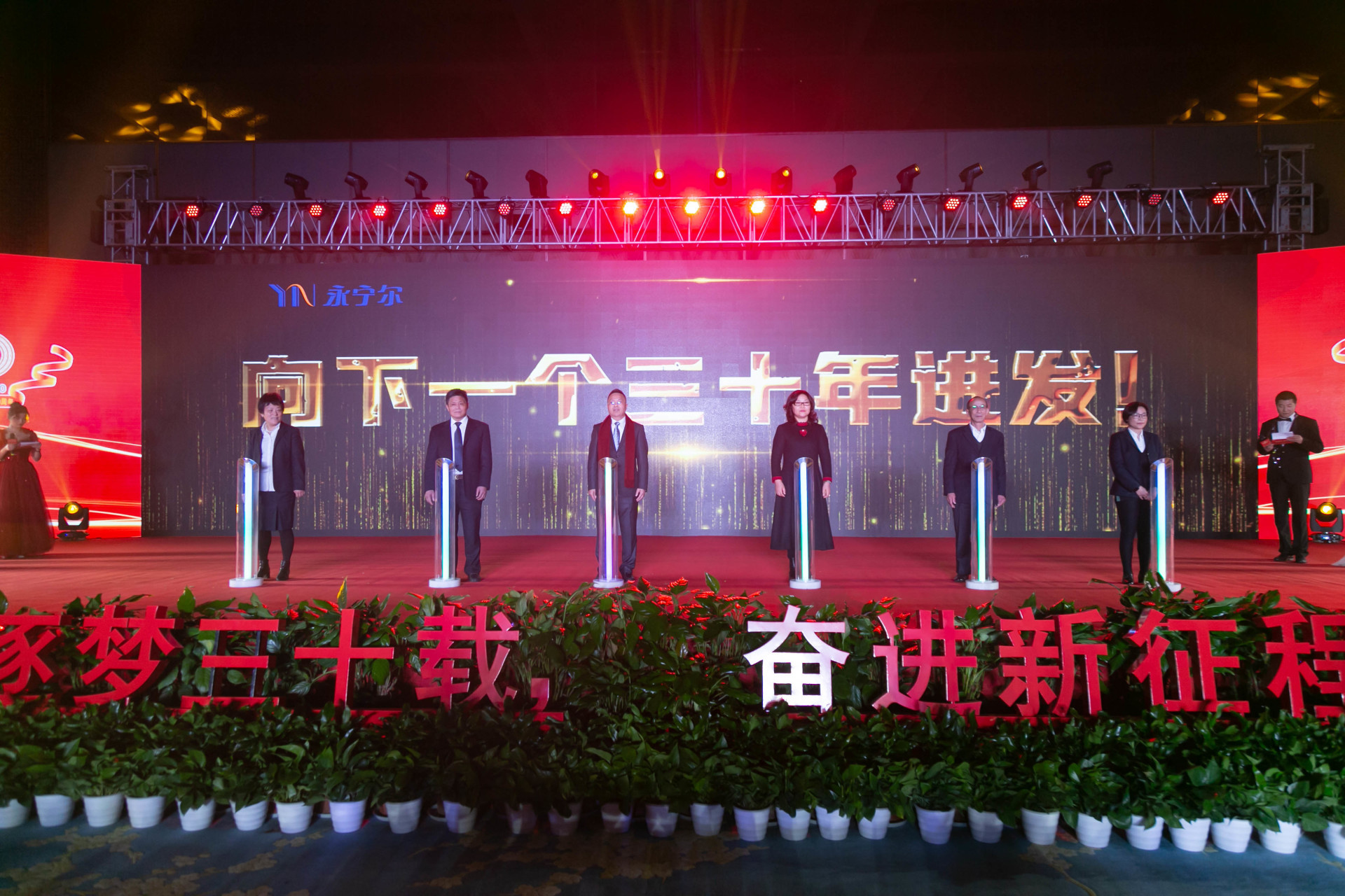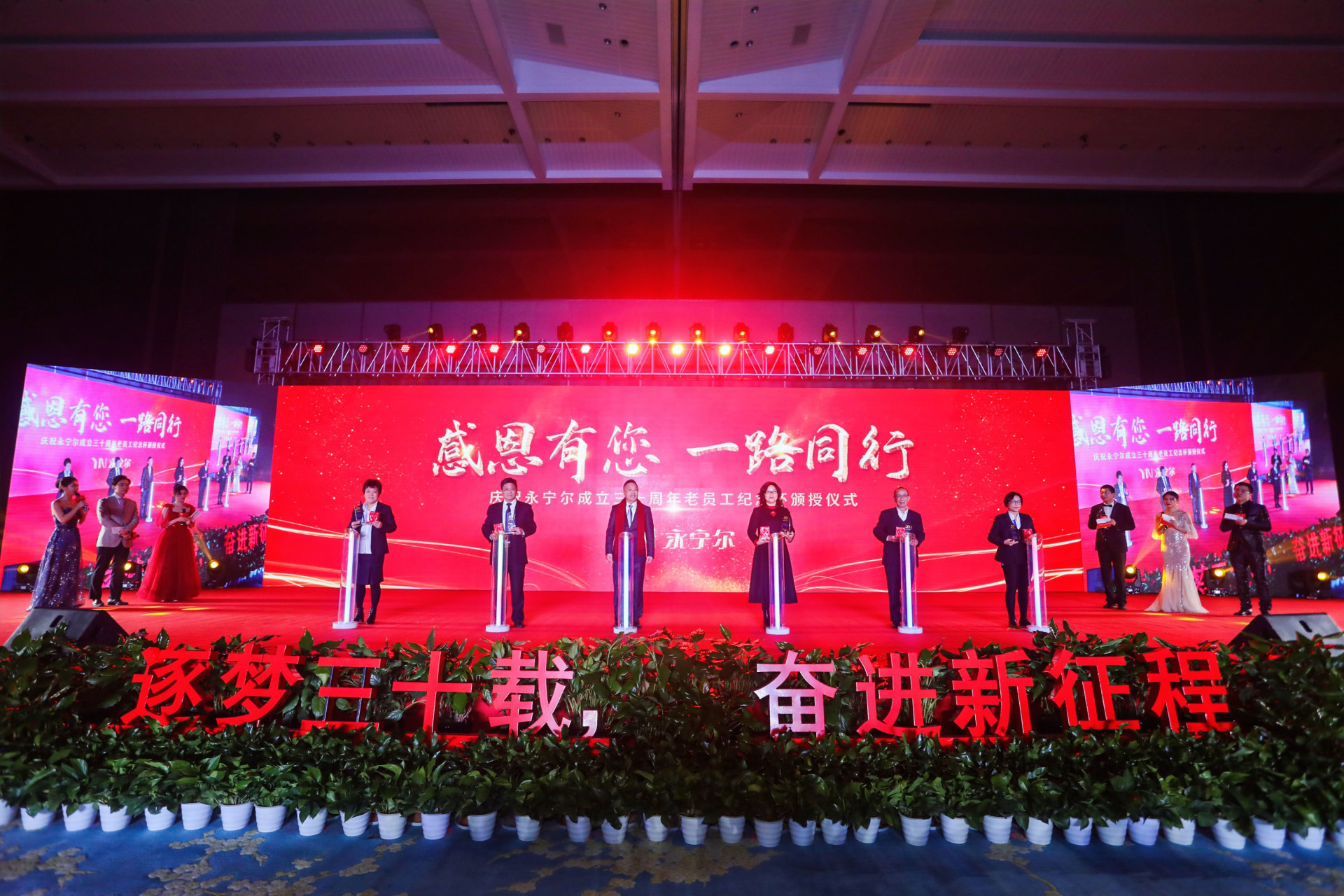 李咏水董事长向导首批登台的老员工启动“向下一个三十年进发”的按钮,,,开启庆祝晚会的序幕