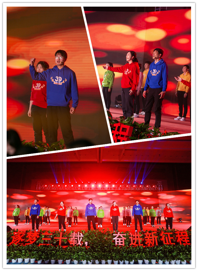 新闻宣布厅晚会现场电子大屏幕上“筑梦三十载 奋进新征程”金色字在炫亮红主底色陪衬下熠熠生辉