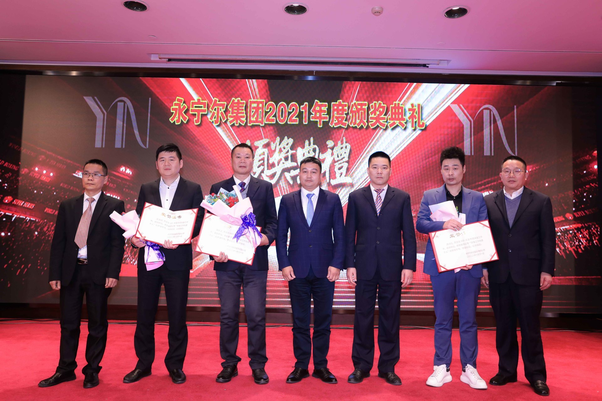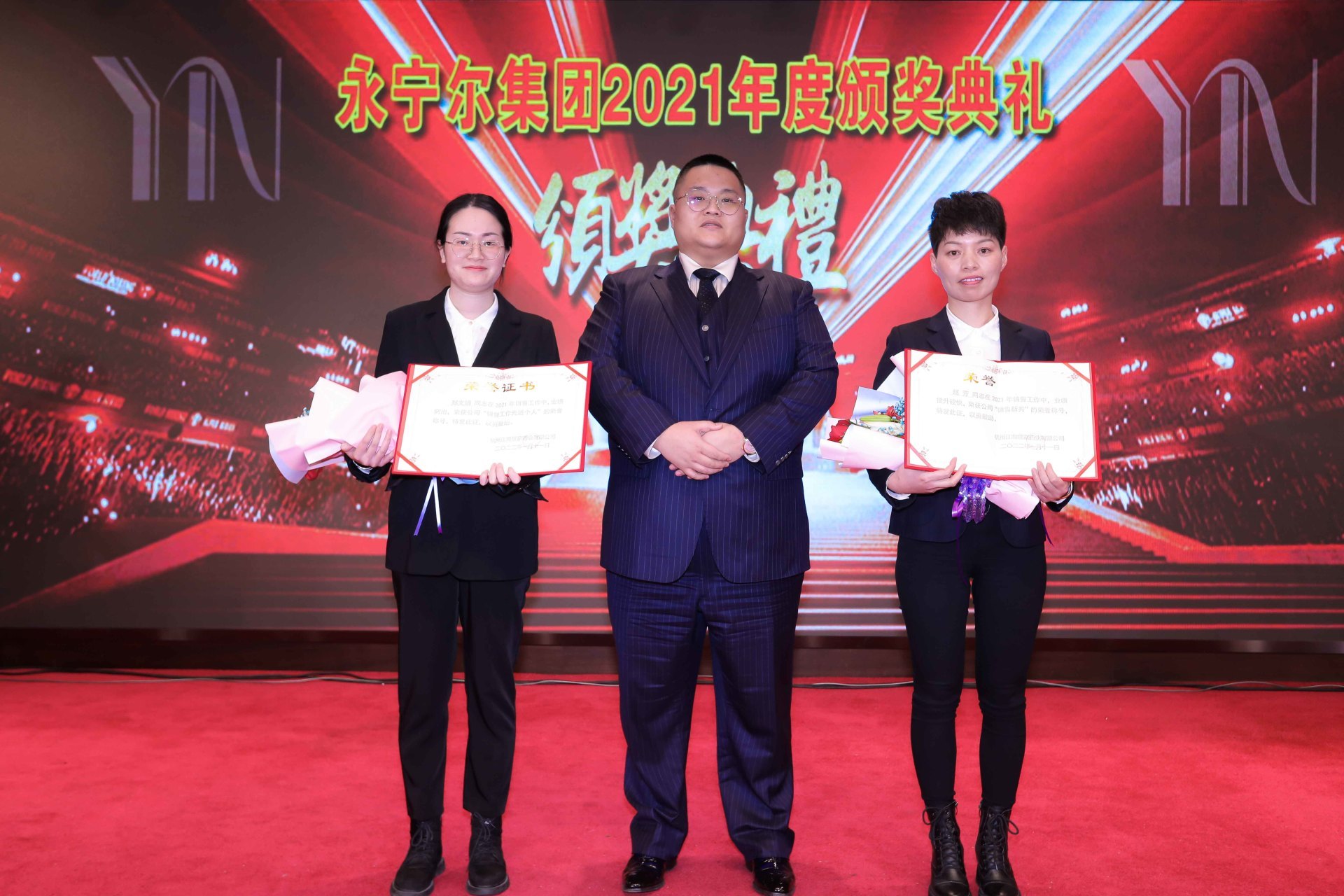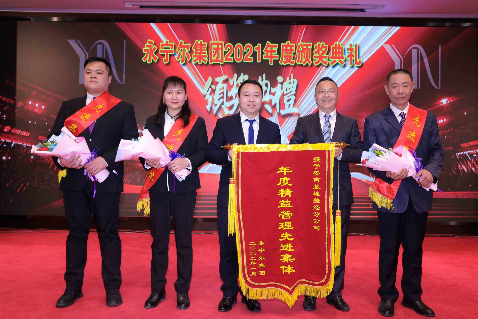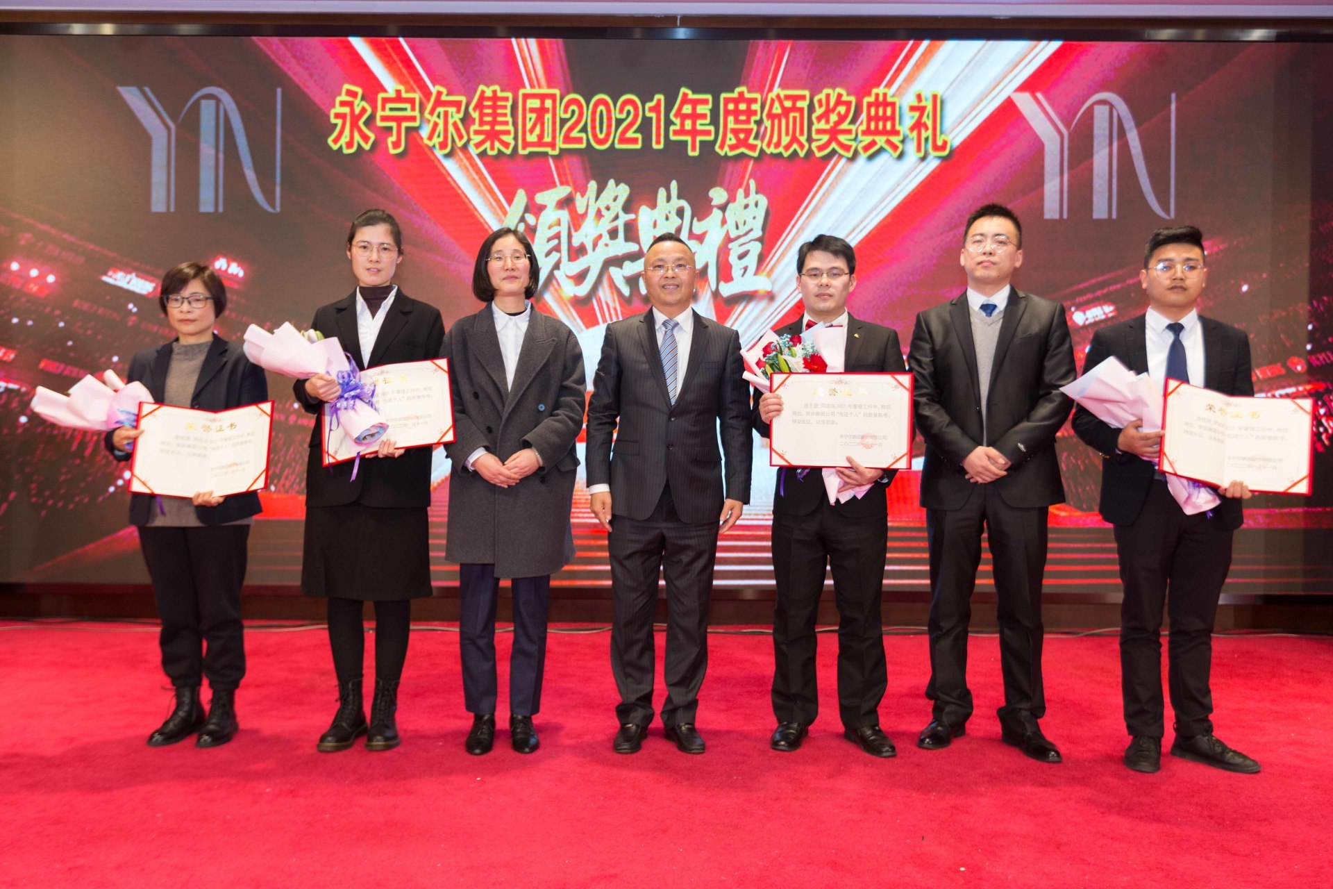 李林娟、高海燕、张千里、李祥同四位荣获集团公司2021年度“企业治理先进个人”,,相关部分认真人为他们颁授声誉证书,,李咏水董事长与先进个人合影