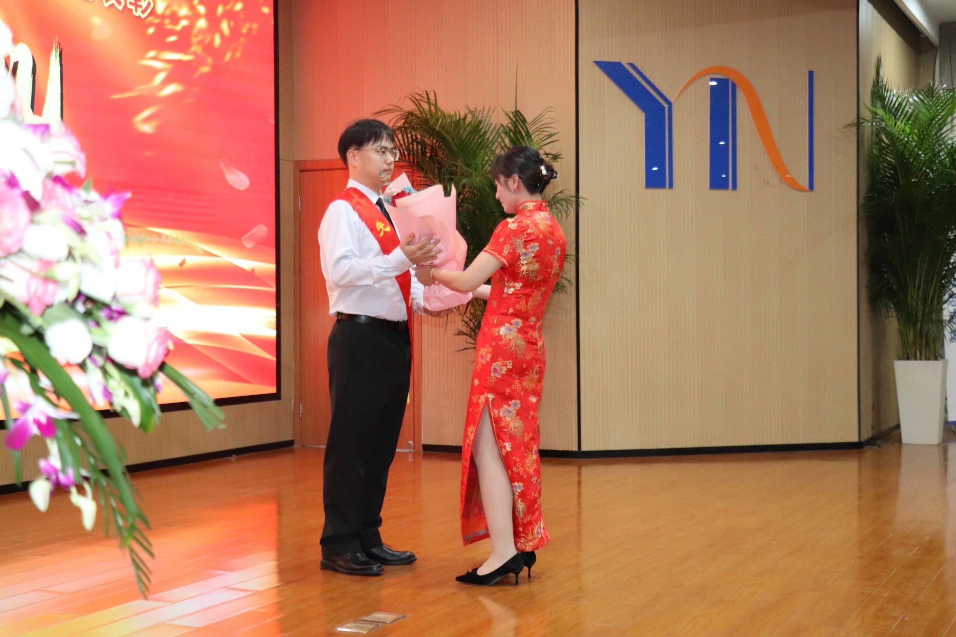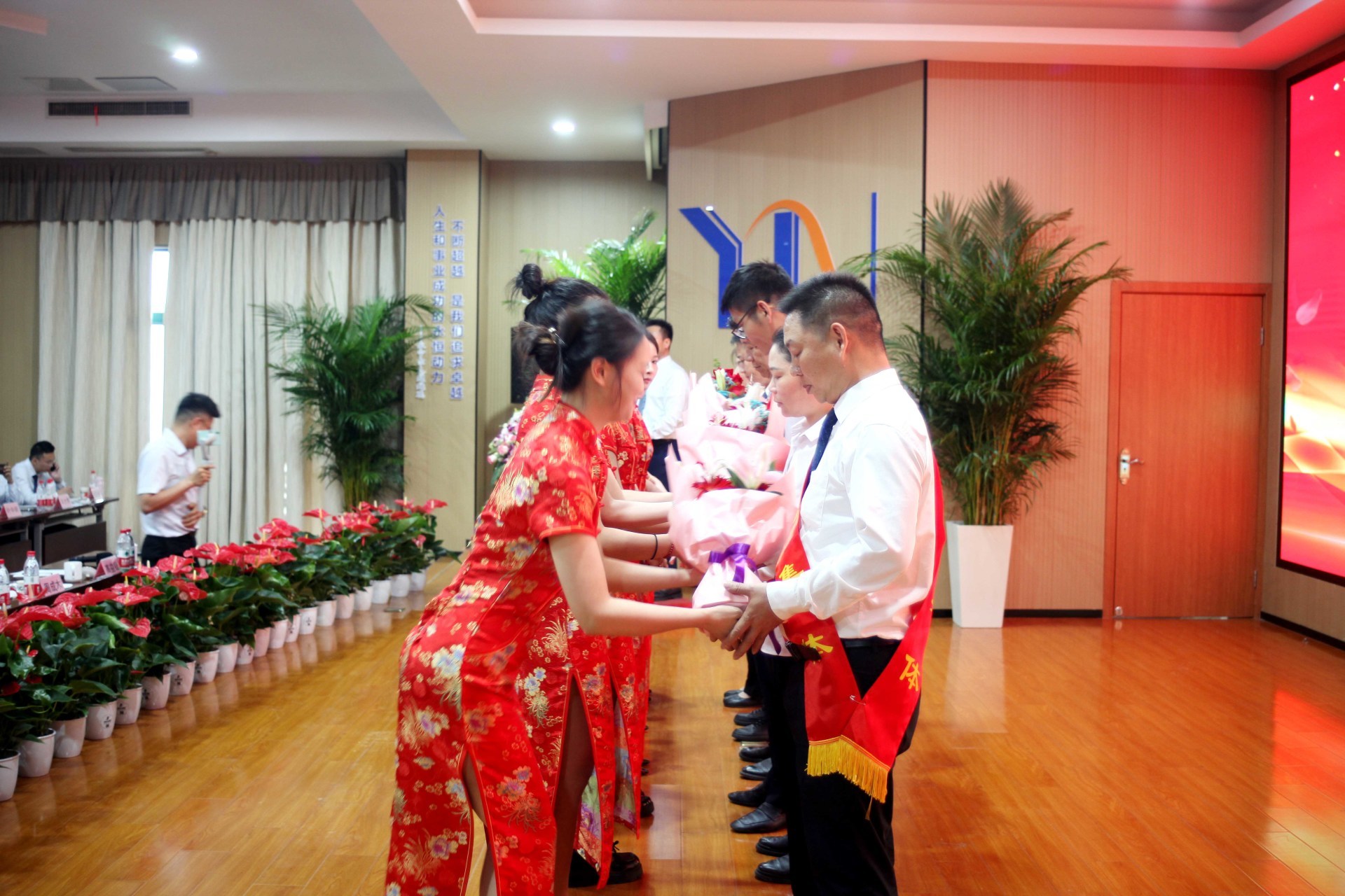 公司礼仪队为江南世家药业先进个人披绶带、献鲜花